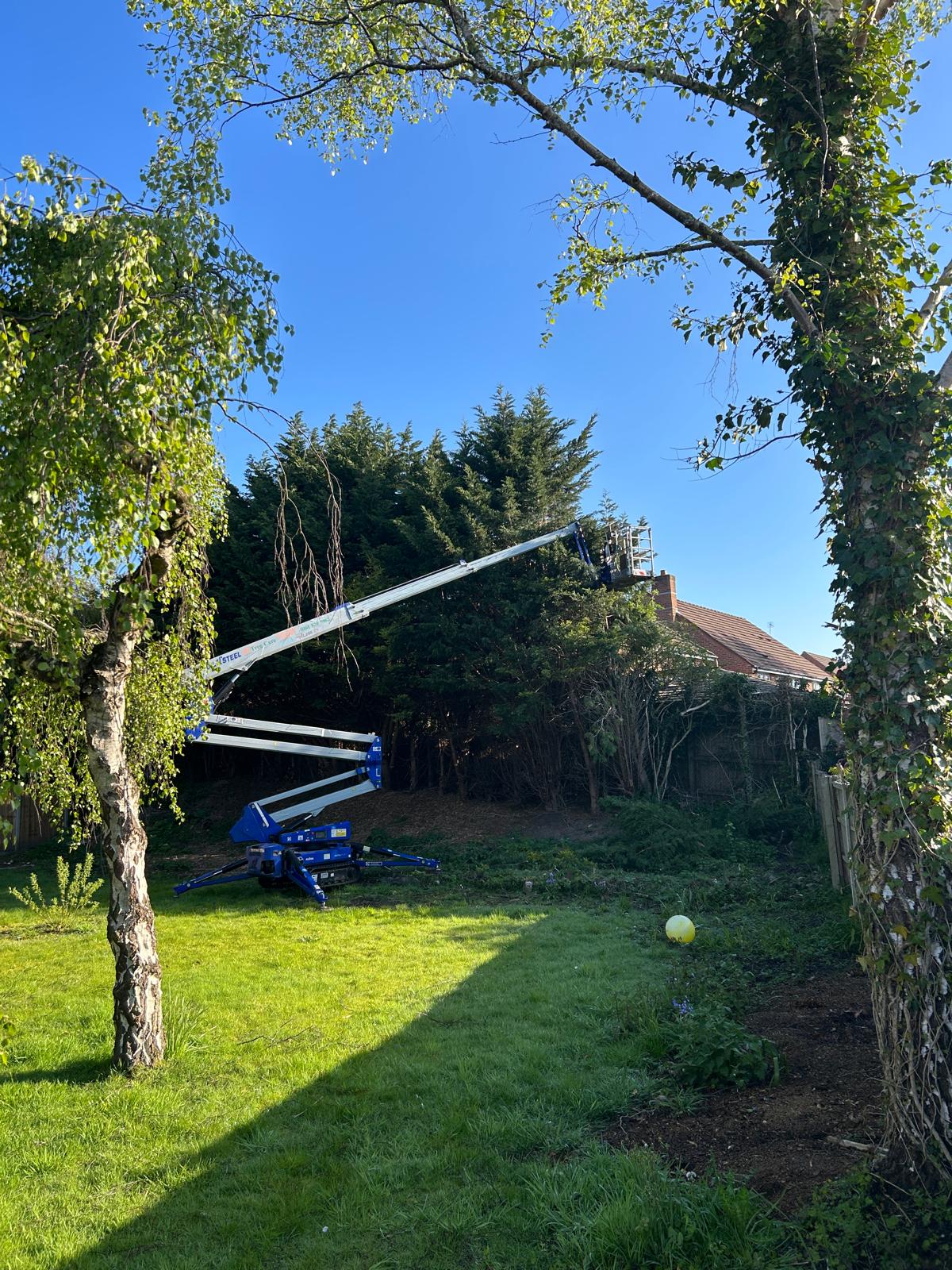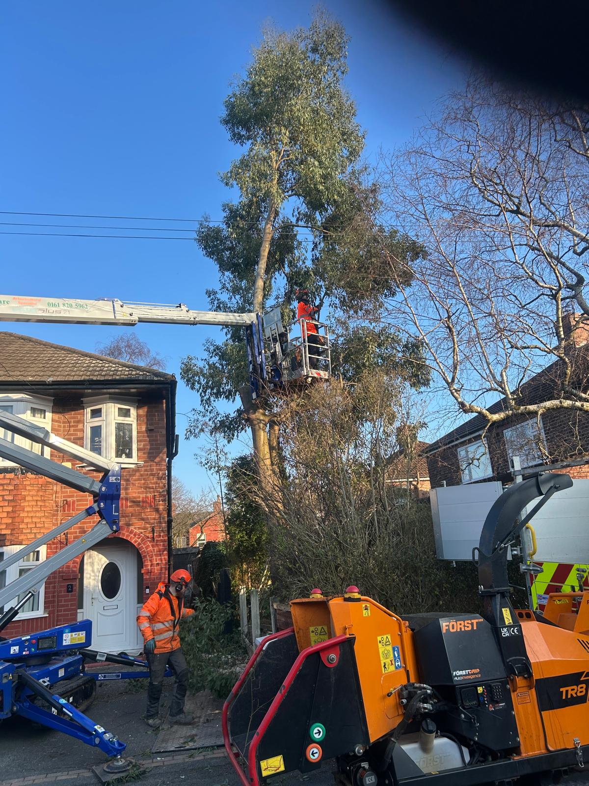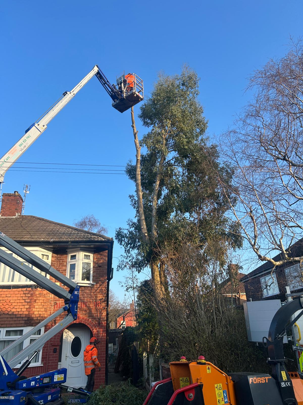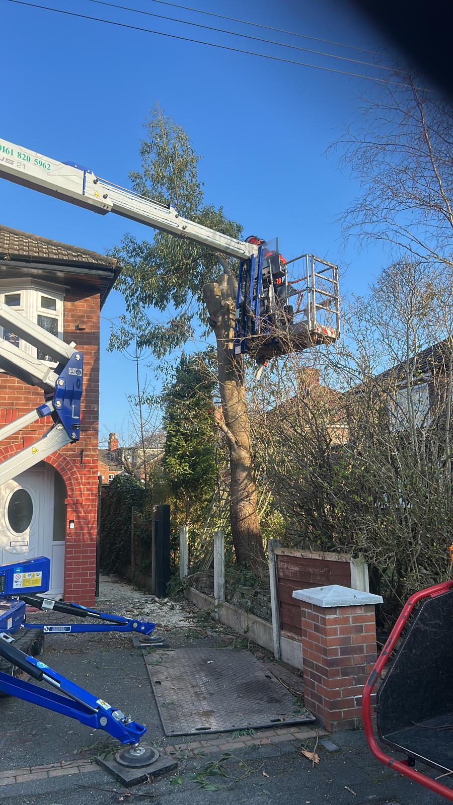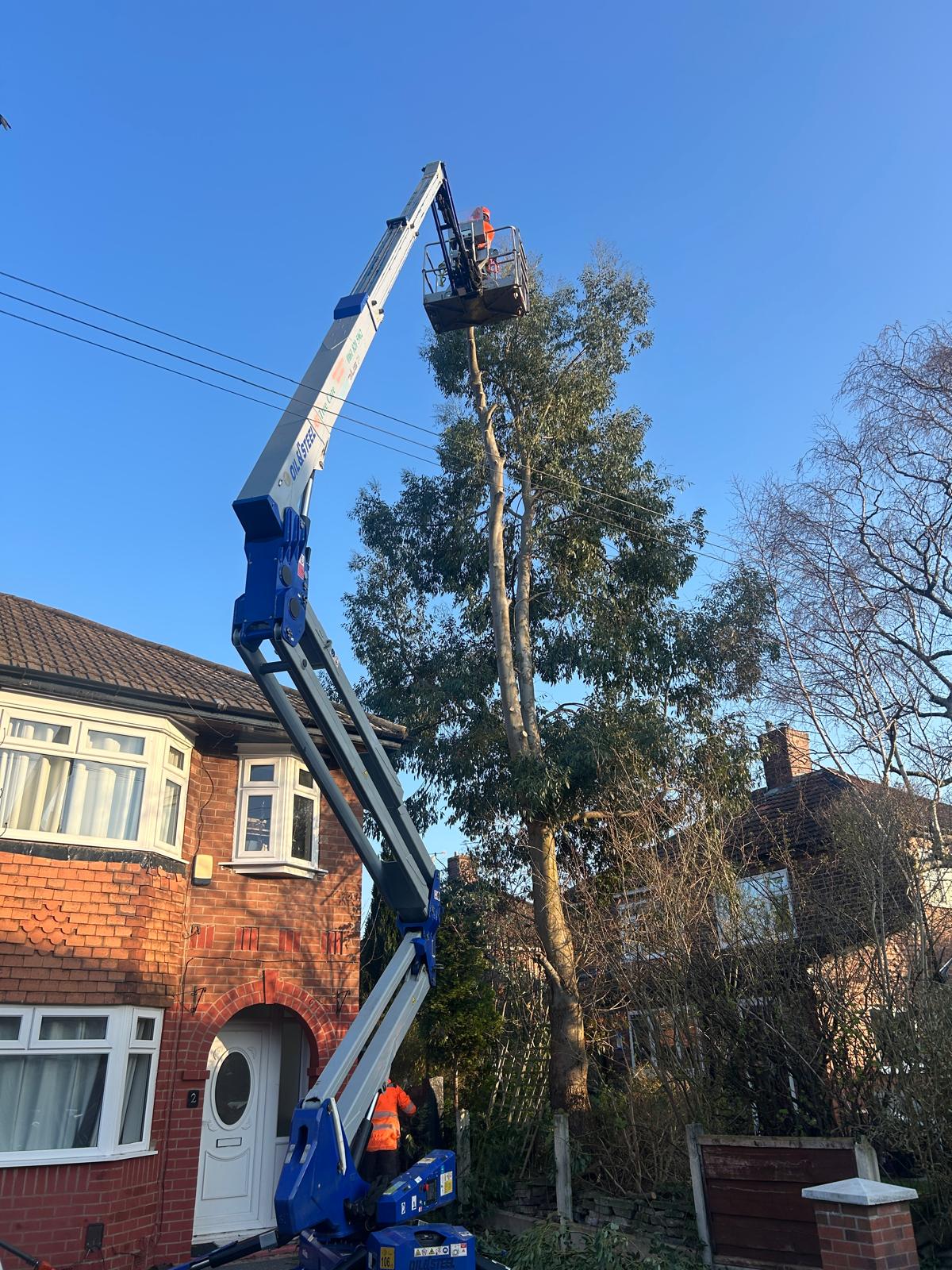 Safe and efficient tree work carried out using a MEWP, with the climber and MEWP operator working closely together — one cutting while the other safely holds and controls sections for a smooth, controlled removal. Today’s job involved the removal of very large, storm-damaged Leylandii, with both teams on site delivering professional results in Cheadle, Stockport.
